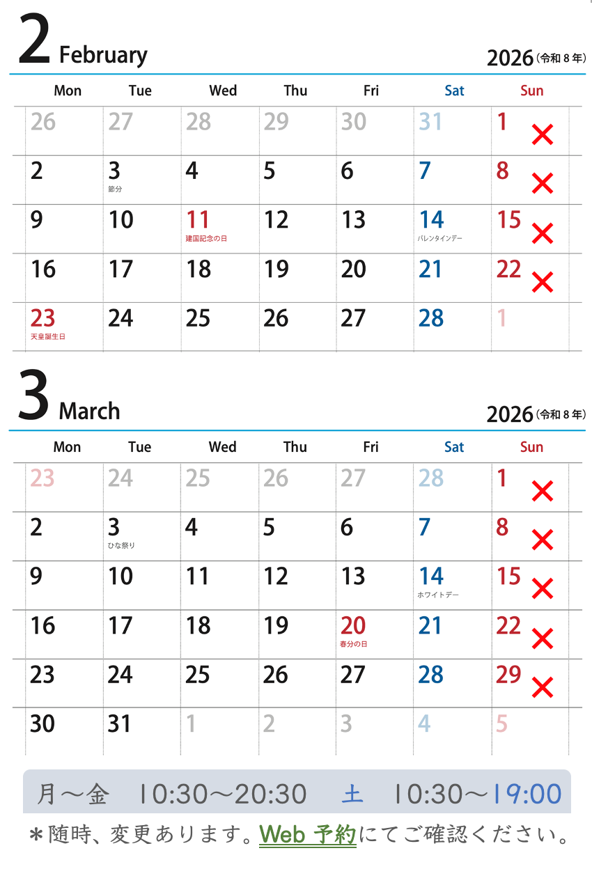 2026.01.30 NEWS 2026年2月と3月の営業予定 前へお知らせトップへ 受付時間 月 火 水 木 金 土 日 10:30-20:30 ● ● ● ● ● △ - ◎土曜日は10:30~19:00 Web予約はこちら